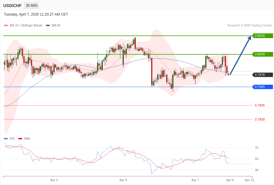 Daily Pivot Point of USD/CHF Sybmol in 30M Time Frame Chart is: 0.7965 and Preferred situation is Bullish.
