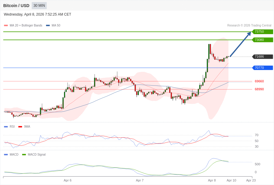 Daily Pivot Point of BITCOIN Sybmol in 30M Time Frame Chart is: 70770 and Preferred situation is Bullish.