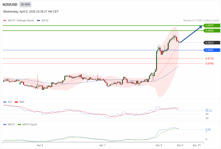 Daily Pivot Point of NZD/USD Sybmol in 30M Time Frame Chart is: 0.5801 and Preferred situation is Bullish.