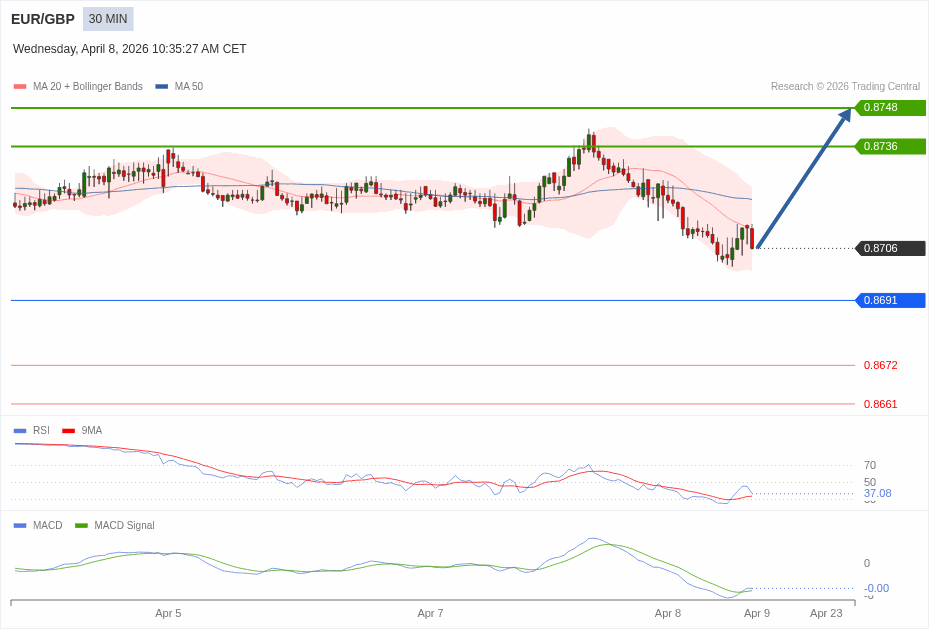 Daily Pivot Point of EUR/GBP Sybmol in 30M Time Frame Chart is: 0.8691 and Preferred situation is Bullish.