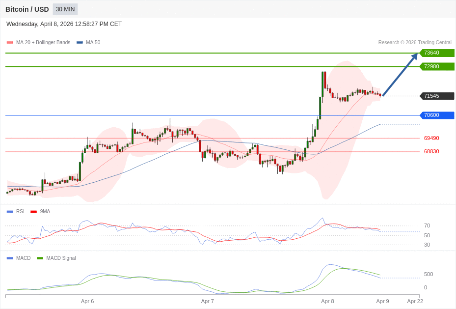 Daily Pivot Point of BITCOIN Sybmol in 30M Time Frame Chart is: 70600 and Preferred situation is Bullish.