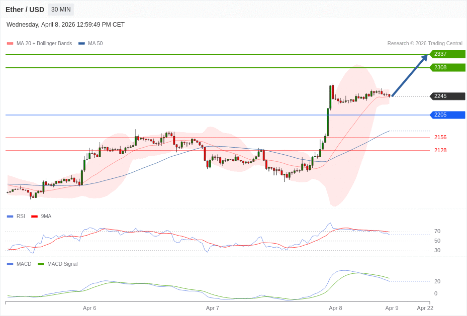 Daily Pivot Point of ETHEREUM Sybmol in 30M Time Frame Chart is: 2205 and Preferred situation is Bullish.