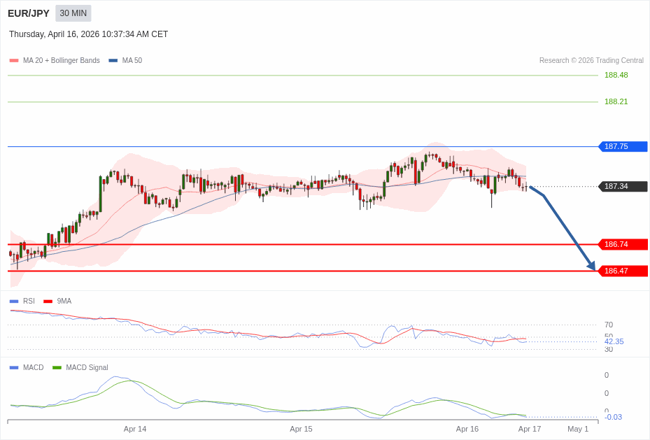Daily Pivot Point of EUR/JPY Sybmol in 30M Time Frame Chart is: 187.75 and Preferred situation is Bearish.