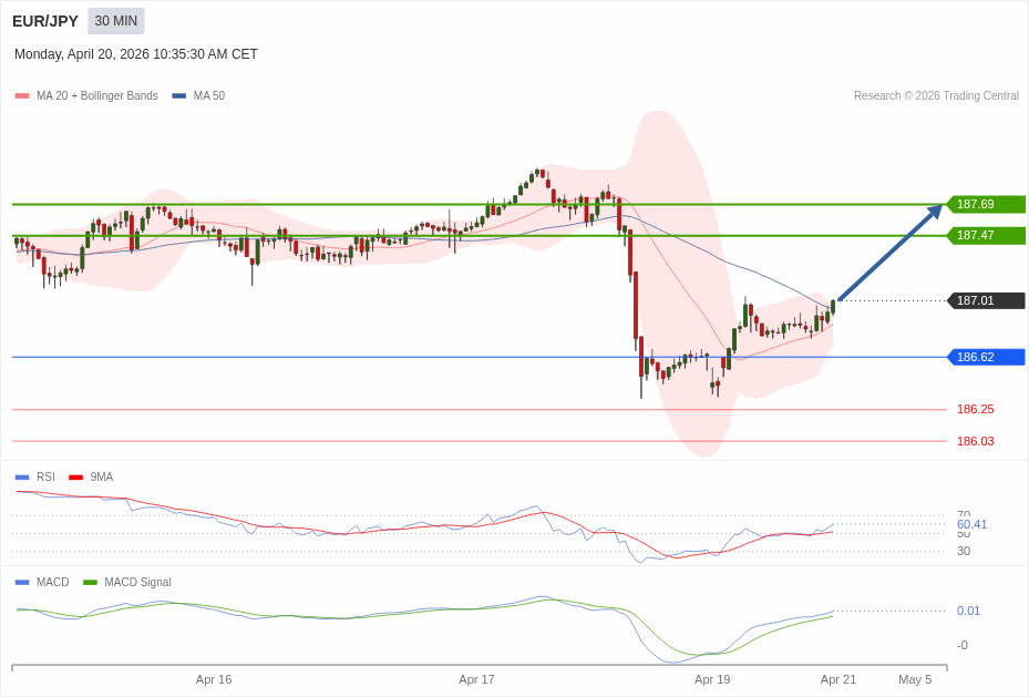 Daily Pivot Point of EUR/JPY Sybmol in 30M Time Frame Chart is: 186.62 and Preferred situation is Bullish.