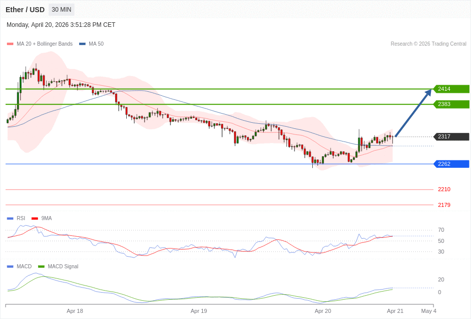Daily Pivot Point of ETHEREUM Chart in 30M Time Frame is: 2262 and Preferred situation is Bullish. Our Preferred Senario is Long Positions (Buy) above 2262 with first target at 2383 and second target at 2414 in extension as take profits.