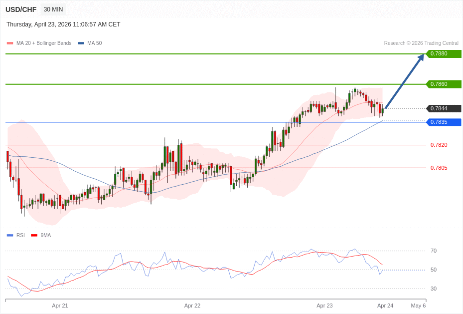 Daily Pivot Point of USD/CHF Sybmol in 30M Time Frame Chart is: 0.7835 and Preferred situation is Bullish.