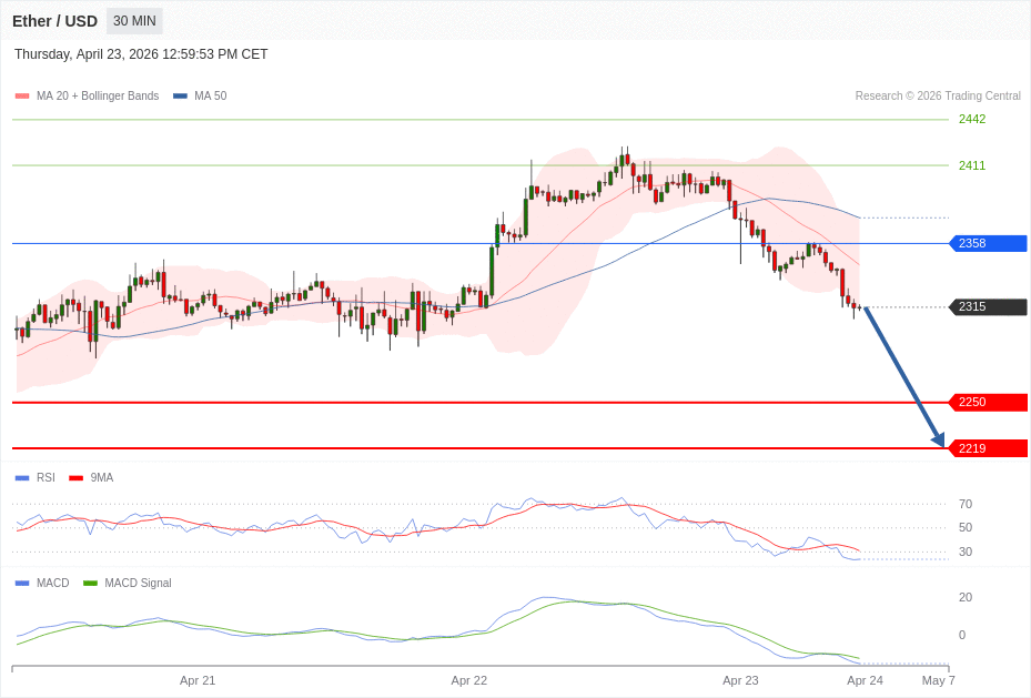 Daily Pivot Point of ETHEREUM Chart in 30M Time Frame is: 2358 and Preferred situation is Bearish. Our Preferred Senario is Short Positions (Sell) under 2358 with first target at 2250 and second target at 2219 in extension as take profits.