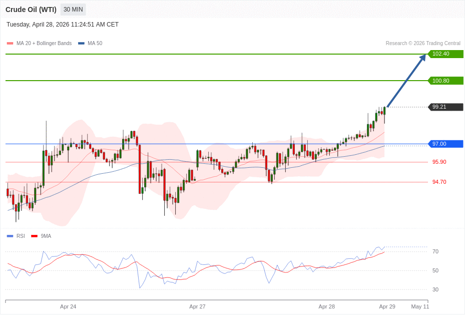 Daily Pivot Point of CRUDE OIL (WTI) Chart in 30M Time Frame is: 94.10 and Preferred situation is Bullish. Our Preferred Senario is Long Positions (Buy) above 94.10 with first target at 97.80 and second target at 99.20 in extension as take profits.