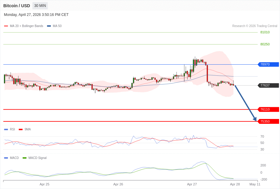 Daily Pivot Point of BITCOIN Chart in 30M Time Frame is: 78970 and Preferred situation is Bearish. Our Preferred Senario is Short Positions (Sell) under 78970 with first target at 76110 and second target at 75350 in extension as take profits.