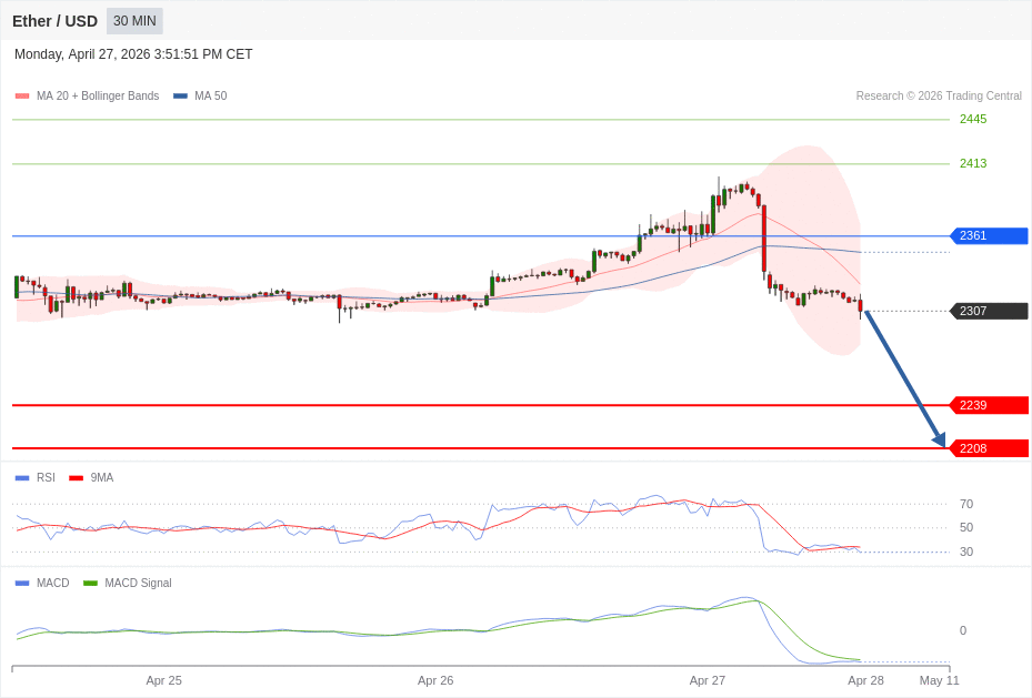 Daily Pivot Point of ETHEREUM Chart in 30M Time Frame is: 2361 and Preferred situation is Bearish. Our Preferred Senario is Short Positions (Sell) under 2361 with first target at 2239 and second target at 2208 in extension as take profits.