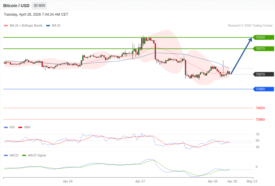 Daily Pivot Point of BITCOIN Sybmol in 30M Time Frame Chart is: 75880 and Preferred situation is Bullish.