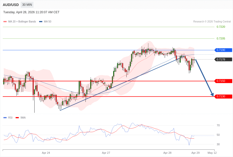 Daily Pivot Point of AUD/USD Sybmol in 30M Time Frame Chart is: 0.7190 and Preferred situation is Bearish.