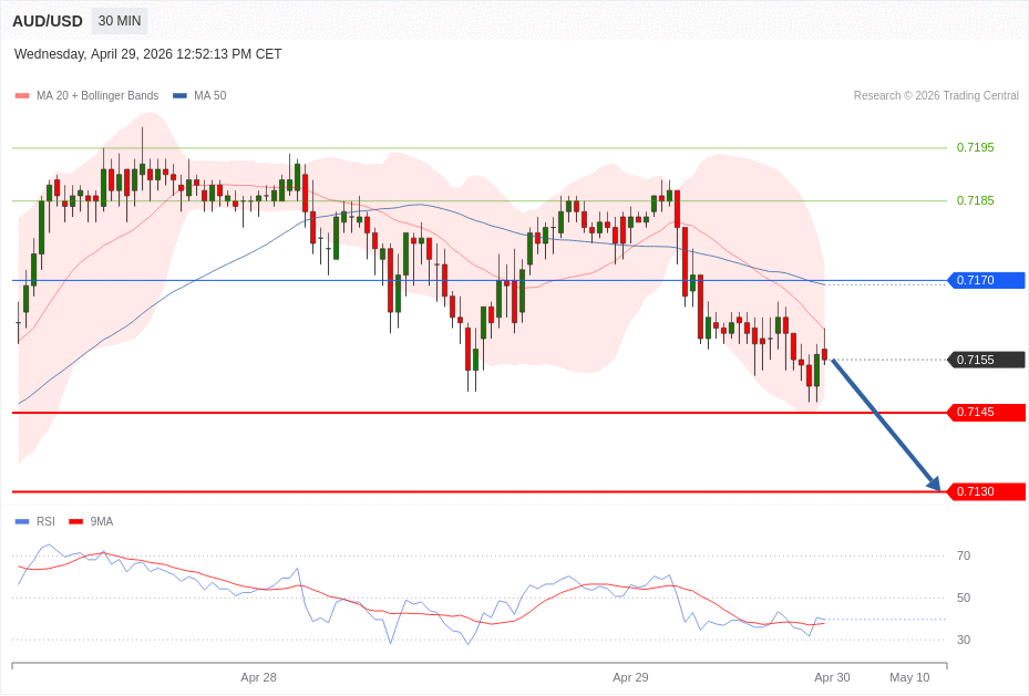 Daily Pivot Point of AUD/USD Chart in 30M Time Frame is: 0.7170 and Preferred situation is Bearish. Our Preferred Senario is Short Positions (Sell) under 0.7170 with first target at 0.7145 and second target at 0.7130 in extension as take profits.