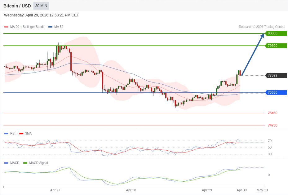Daily Pivot Point of BITCOIN Chart in 30M Time Frame is: 76630 and Preferred situation is Bullish. Our Preferred Senario is Long Positions (Buy) above 76630 with first target at 79300 and second target at 80000 in extension as take profits.