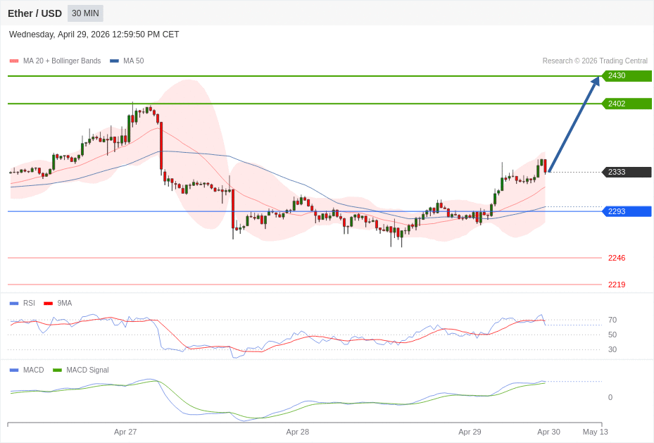 Daily Pivot Point of ETHEREUM Chart in 30M Time Frame is: 2293 and Preferred situation is Bullish. Our Preferred Senario is Long Positions (Buy) above 2293 with first target at 2402 and second target at 2430 in extension as take profits.