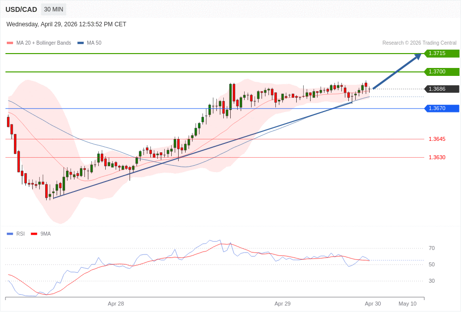 Daily Pivot Point of USD/CAD Chart in 30M Time Frame is: 1.3670 and Preferred situation is Bullish. Our Preferred Senario is Long Positions (Buy) above 1.3670 with first target at 1.3700 and second target at 1.3715 in extension as take profits.