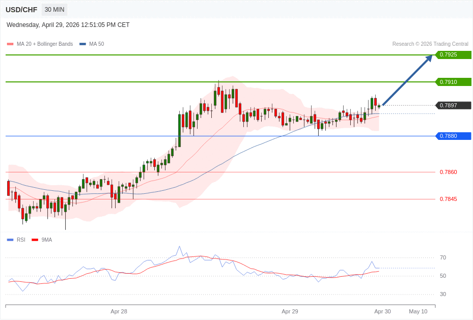 Daily Pivot Point of USD/CHF Chart in 30M Time Frame is: 0.7880 and Preferred situation is Bullish. Our Preferred Senario is Long Positions (Buy) above 0.7880 with first target at 0.7910 and second target at 0.7925 in extension as take profits.