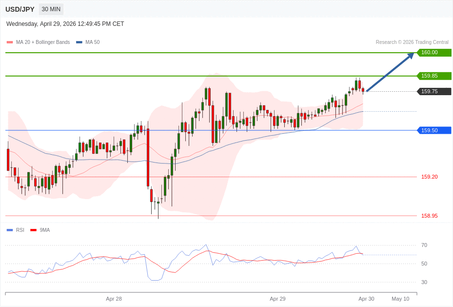 Daily Pivot Point of USD/JPY Chart in 30M Time Frame is: 159.50 and Preferred situation is Bullish. Our Preferred Senario is Long Positions (Buy) above 159.50 with first target at 159.85 and second target at 160.00 in extension as take profits.