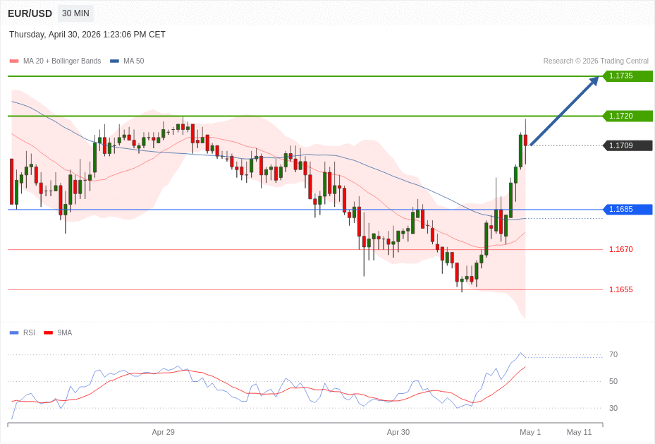 Daily Pivot Point of EUR/USD Sybmol in 30M Time Frame Chart is: 1.1685 and Preferred situation is Bullish.