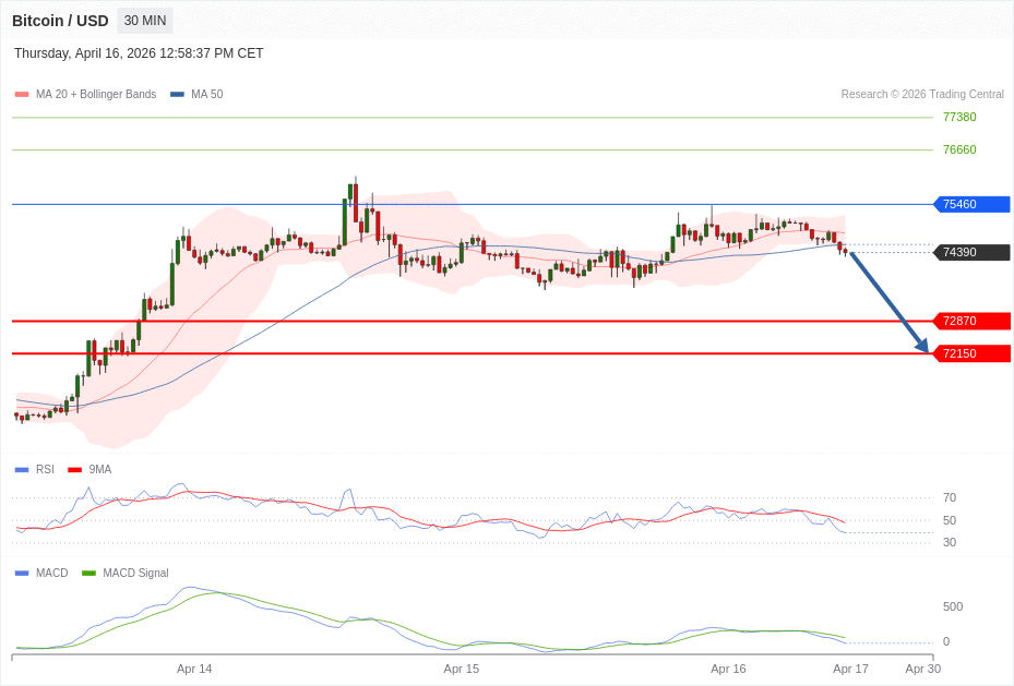 Daily Pivot Point of BITCOIN Chart in 30M Time Frame is: 75460 and Preferred situation is Bearish. Our Preferred Senario is Short Positions (Sell) under 75460 with first target at 72870 and second target at 72150 in extension as take profits.
