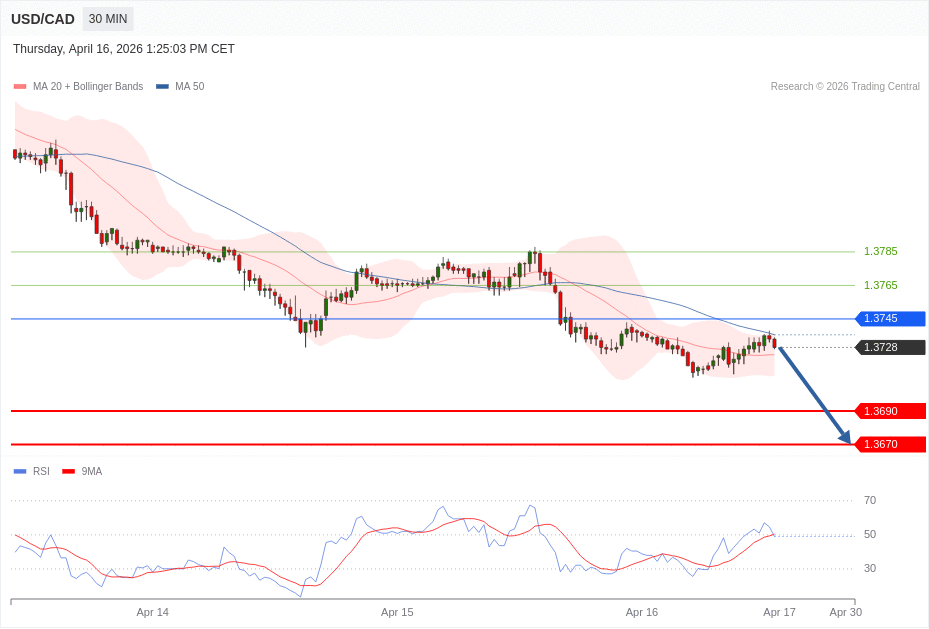 Daily Pivot Point of USD/CAD Chart in 30M Time Frame is: 1.3745 and Preferred situation is Bearish. Our Preferred Senario is Short Positions (Sell) under 1.3745 with first target at 1.3690 and second target at 1.3670 in extension as take profits.